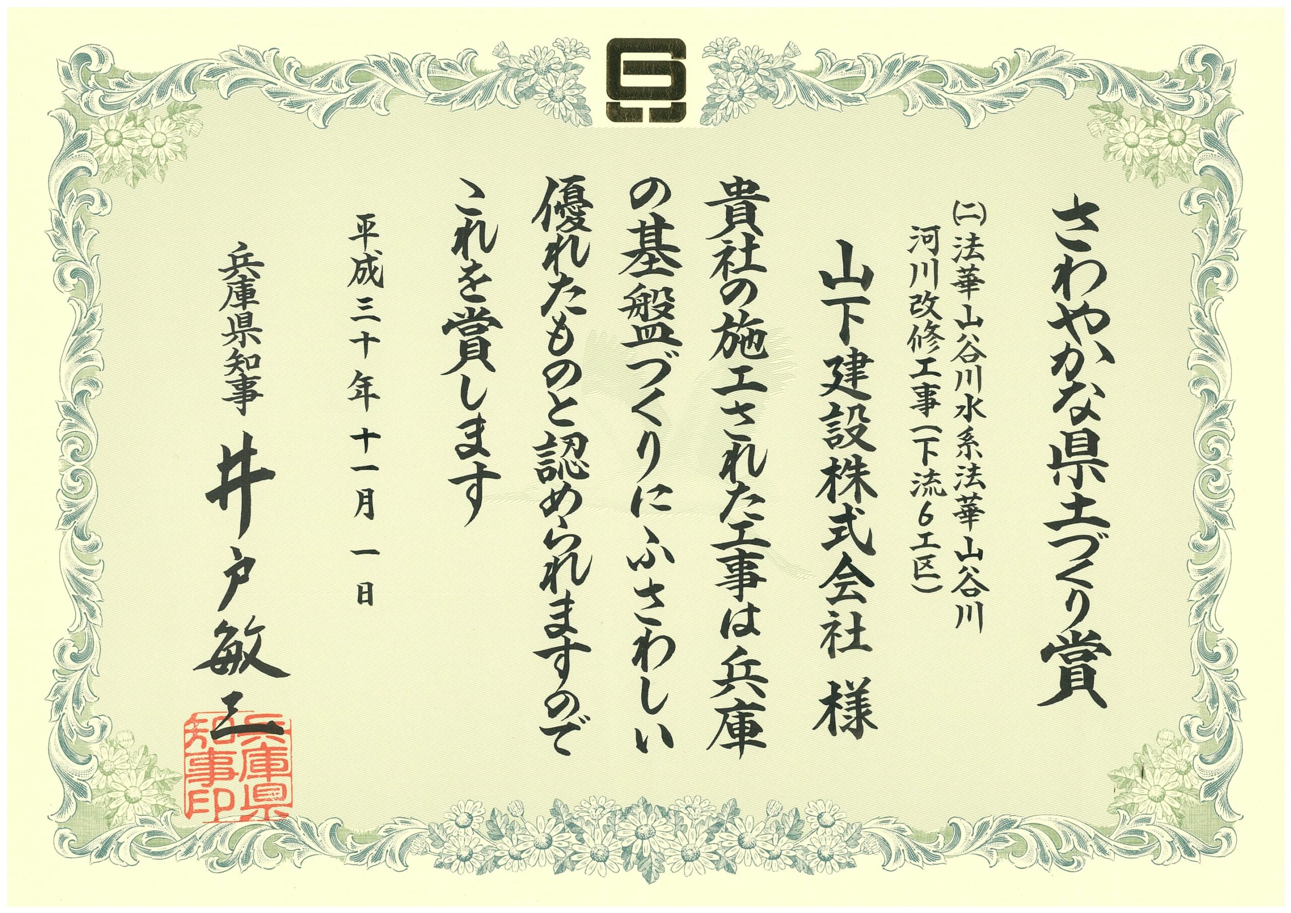 この賞は、兵庫県が発注した工事のうち、施工状況が特に優秀な建設現場に与えられる賞です。